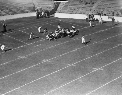 Frequently in the game with Baylor at Texas Christian University, TCU was repulsed at the goal line by various means, as the picture shows with Referee's flying glad that signals "in motion" foul on the play. Published in Fort Worth Star-Telegram evening edition November 6, 1950.