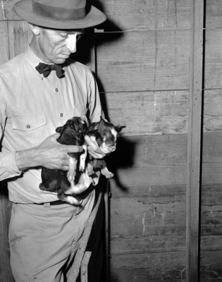 Agnew holds two squirming future prizewinning Berkshires. Published in Fort Worth Star-Telegram January 1951.
