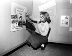 Image shows Faye Stone, 3027 Cockrell, Texas Christian University (TCU) art student, studying advertising layout. At the 1950 Affiliated Advertising Agencies Network Exhibition in the college's art gallery. She is looking at the engravers working layout for an acetate overlay job. Published in the Fort Worth Star-Telegram morning edition , November 7, 1950.