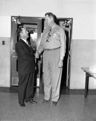 Image shows left to right, Reverend Roy O. Young, Lewisville and J. F. Gross, Pharr. J. F. Gross, 6 foot 8 inch, Sunday School superintendent of the First Baptist Church in Pharr is talking with Reverend Roy O. Young, 5 foot 6 inch, First Baptist Church pastor in Lewisville. Published in the Fort Worth Star-Telegram evening edition , November 7, 1950.
