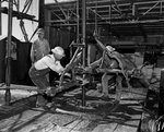 Members of the crew at the Ralph Lowe, Midland, No. 1 J. E. Hill, section 30, block 39, T-2-S, T&P survey, two-pay prospect in Midland County, which was the nearest producer to Midland. Six miles southwest of the city, it has indicated production from the Spraberry and Wolfcamp. J. H. Whittie is shown working with two unidentified crew members. Published in the Fort Worth Star-Telegram morning edition, November 12, 1950.