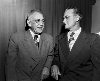 Pictured here are John J. Hill, left, who retired as East Texas division manager for the Service Pipe Line Company and his successor Frank Willenburg, right, as an assistant. Hill was honored with a party at the Worth Hotel, when he was presented with a television set and scroll signed by employees in the division. Published in the Fort Worth Star-Telegram evening edition, November 8, 1950.