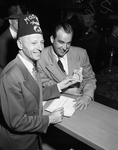Image shows George Barton, left, and H. H. Anderson, manager of Hotel Texas. Anderson is buying first tickets to the eight annual Moslah Shrine Circus in Will Rogers Memorial Coliseum from George Barton. Published in the Fort Worth Star-Telegram evening edition , November 8, 1950.