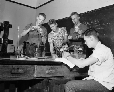 Image shows four Breckenridge High School students, from left to right, Donald Robbins, Gary Rice, Ronald Robbins and Dickey Phillips, inside a chemistry lab. They are shown operating and inspecting chemistry lab equipment for their competition against Mineral Wells. Published in the Fort Worth Star-Telegram morning edition , November 9, 1950.