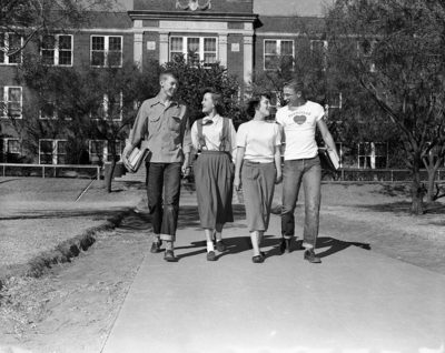 Image shows four Breckenridge High School Students, from left to right, David Buchanan, Carolyn Mabery, Joyce Sue Teague and Larry Knight, walking on pathway outside of building. Published in the Fort Worth Star-Telegram morning edition , November 9, 1950.