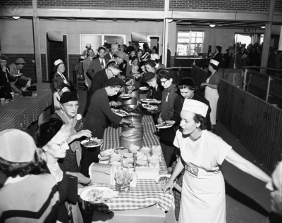 Image shows mealtime shot at the Baptist General Convention. Crowds are shown, with plates, by serving tables in Cattle Barn Number 3 at Will Rogers Memorial Auditorium . 2,000 people were fed in an hour. Published in the Fort Worth Star-Telegram evening edition , November 8, 1950.