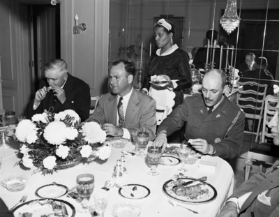 Amon Carter Junior, center, eating with two other men at the Baptist General Convention.