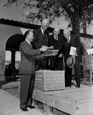 The 51-year-old cornerstone of the administration building at the Methodist Home in Waco was removed and its contents were viewed by, left to right, Hubert Johnson, Waco; Bishop H. A. Boaz, Dallas; Rev. C. V. Bailey, and Rev. Mac Smith, both of Waco. Published in the Fort Worth Star-Telegram morning edition, November 9, 1950.