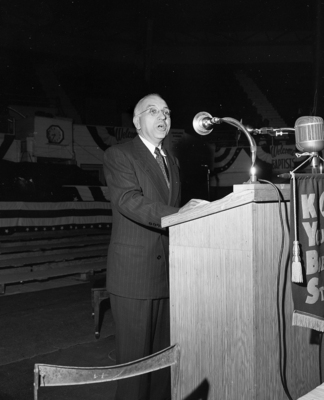 Image shows Dr. J. Howard Williams, executive secretary, making report to the Baptist General Convention of Texas in Will Rogers Memorial Coliseum. He is shown speaking at a podium. Published in the Fort Worth Star-Telegram morning edition , November 9, 1950.