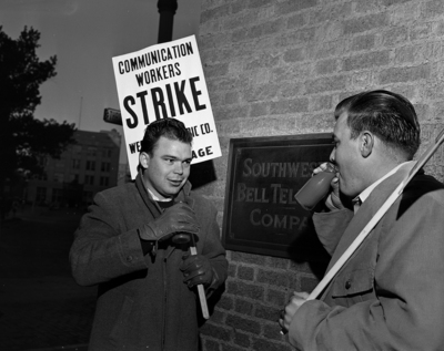 T. E. Monkres of 3005 Bishop, left, stopped walking at the downtown telephone exchange momentarily to watch his fellow picket, O. F. Smith of 1119 Travis, fight the chill wind with a bottle of coffee. Both were Western Electric telephone installers and carried strike signs. Published in the Fort Worth Star-Telegram evening edition, November 9, 1950.
