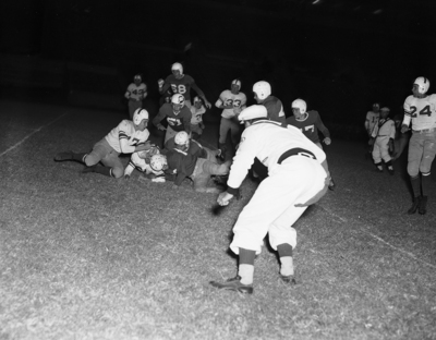 D. K. Robinson (white jersey, center) of Amon Carter Riverside covers a fumble in the game at Farrington Field against Technical. At left is Bill Sharp of the Eagles, who fumbled. Coming in too late to contest for the ball is Joe Skinner (51) of Tech. Published in Fort Worth Star-Telegram morning edition November 10, 1950.