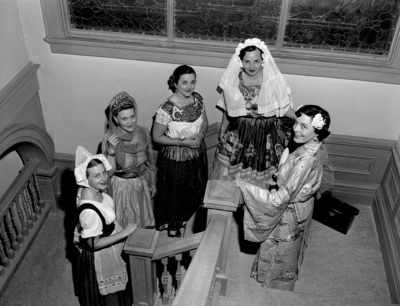 Five members of the Provarsu Club who participated in the International Relations luncheon program of the Texas Federation of Women's Clubs in the Blackstone Hotel were, left to right, Mmes. Herman Dawson, Paul Allison, Roy E. Ward, C. Aubrey Stewart, and W. L. Ballenger. Published in the Fort Worth Star-Telegram evening edition, November 14, 1950.