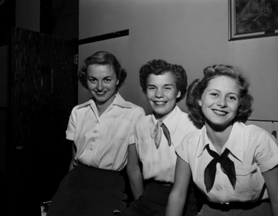 Doris Tindle, Vera Hollis and Sue Harlan, left to right, were presented to students and exes of Lake Worth High School as football sweethearts for 1950. They were introduced by football Captains Clifton Petrea, Billy Terry and John Ewing during halftime at the homecoming game with Keller High School. Published in the Fort Worth Star-Telegram morning edition, November 11, 1950.