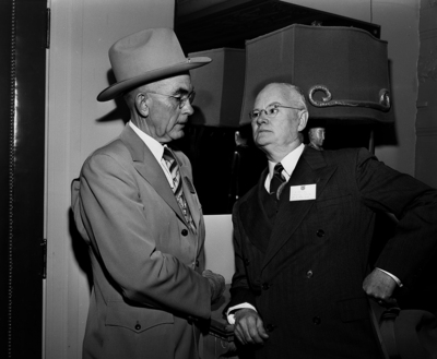 Clint C. Mason, left, Colorado rancher and former Arlington State College teacher, and Fred R. Horton of Dallas were among early arrivals at the 90th Division Association meeting. Published in the Fort Worth Star-Telegram evening edition, November 10, 1950.