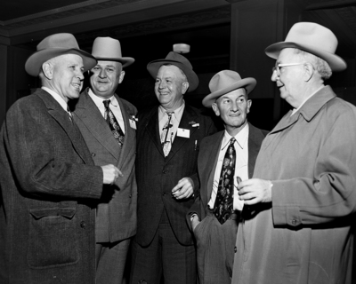 As members of the 90th Division Association gathered for a reunion to renew friendships, these men stopped to chat in the Hotel Texas lobby. Left to right Howard B. Hopps , Oklahoma City; O. E. Carlisle, Farmersville; Claude Claxton, Norman, Oklahoma; Roy K. Kline, Fort Worth, and Alex R. Schell, Plano. Published in the Fort Worth Star-Telegram morning edition, November 11, 1950.