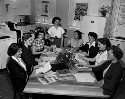 The officers of the Birdville High School chapter of the Future Homemakers of America are, left to right, Madiline French, parliamentarian; Peggy Petty, historian; Jane Reddell, reporter; Shirley Carlton, president; Jeannette Renegar, secretary; Glynn Brunson, vice president; Katy Crouch, treasurer, and Jimmie Lee Bailey, song leader. Published in the Fort Worth Star-Telegram evening edition, November 13, 1950.