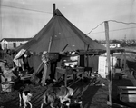 View of a tent where a destitute family lives. Six children await Santa here. Published in the Fort Worth Star-Telegram morning edition, November 13, 1950.