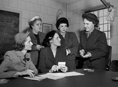 Christmas musical programs for the patients at the U. S. Public Health Service Hospital were planned by Fort Worth music clubs. Federated club representatives who conferred were, left to right, standing, Mmes. N. D. Chenault, Music Study Club; Will Foster, music and hospital chairman, 1st District, Texas Federation of Music Clubs; E. G. Haubold, University Place Music Club, and seated, Mmes. Luther Gillespie, Euterpean Club, and Victor Ginn, Harmony Club. Published in the Fort Worth Star-Telegram evening edition, November 13, 1950.