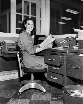 Mrs. Wanda Bucking was crowned the champion of the 16th annual Texas Women's Bowling Association tournament at Amarillo, averaging 183 pins for nine games to dethrone San Antonio's three-ply titlist, Grace Baskin. Mrs. Bucking is shown seating at her desk. Published in the Fort Worth Star-Telegram evening edition, November 14, 1950.