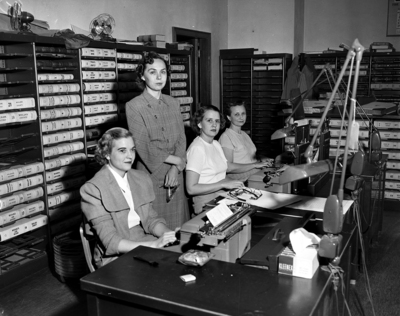 Increased oil activity in Midland County has overtaxed the county clerk's staff, now 1,500 instruments behind. Left to right, Miss Lynelle Maddox, chief clerk; Mrs. Lucille Johnson, county clerk; Mrs. Rosenelle Cherry and Mrs. Ruby Murray. Published in the Fort Worth Star-Telegram morning edition, November 19, 1950.