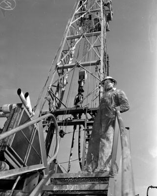 C. McCullough, driller on the Weiner No. 1-4 O'Daniel, checks operations from the rig floor. The outpost is 1 1/2 miles northeast of the Tex Harvey area, producing from the Spraberry sand.