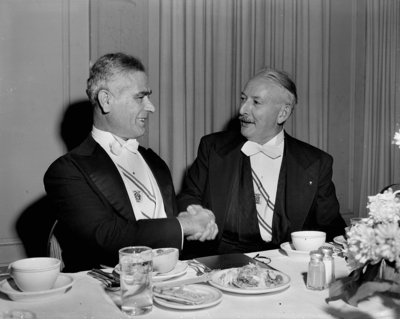 Fred Joseph, left, of Taylor, master of the 4th degree for the northeastern district, Knights of Columbus, for Texas, congratulates Edward J. Steiner, right, faithful navigator of Fort Worth, at the organization's banquet in Hotel Texas. Published in the Fort Worth Star-Telegram evening edition, November 13, 1950.