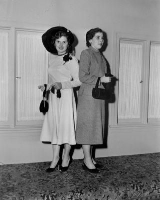 Fort Worth area winners who competed in a state sewing contest were chosen at Hotel Texas. Left to right, Mrs. Elnora Miller Smith, 19, of Gainesville, winner in the senior division, and Miss Cynthia McKethan, 16, McGregor, junior division winner. Published in the Fort Worth Star-Telegram morning edition, November 12, 1950.