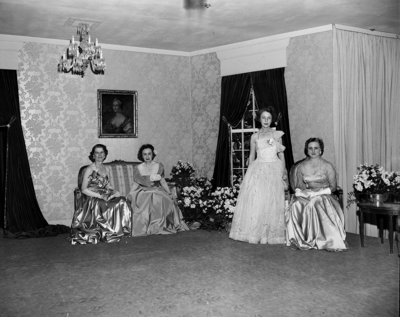 Committee chairmen who were in charge of arrangements for the 35th Assembly Ball held at River Crest Country Club are shown in the setting from which nine debutantes made their bows. The chairmen are, left to right, Mmes. Bert K. Smith Jr., Roger B. Owings, W. A. Schmid and C. D. Williamson. Mrs. E. P. Van Zandt was chairman of the refreshments committee. Published in the Fort Worth Star-Telegram evening edition, November 15, 1950.