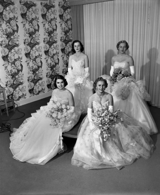 Four of the girls who made their formal debuts at the 35th Assembly ball at River Crest Country Club, were, standing, left to right, Miss Olive Beaton; and Miss Patricia Honea; seated, left to right, Miss Mary Moore Thompson and Miss Onah Barwise. Misses Kay Fortson and Marianne Stripling were also presented at the ball. Published in the Fort Worth Star-Telegram morning edition, November 11, 1950.
