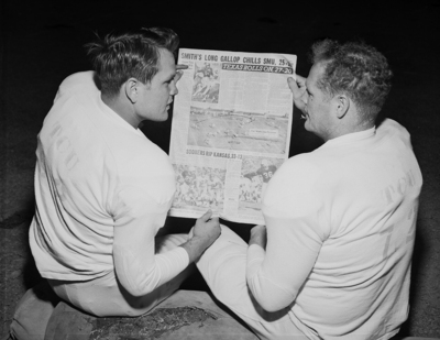 Max Eubank, left, named co-captain by the Frogs for Texas Christian University's homecoming game with University of Texas, scans sports page pictures of a Longhorn pass play with Captain-Tackle Clarence Marable. Published in Fort Worth Star-Telegram morning edition November 14, 1950.