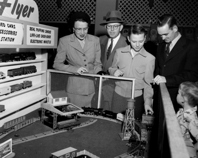 Gene Ingebritson, a McLean Junior High 8th-grader, was intrigued with an elaborate electric train layout in a department store's toy display and manned the control momentarily. Published in the Fort Worth Star-Telegram evening edition, November 15, 1950.
