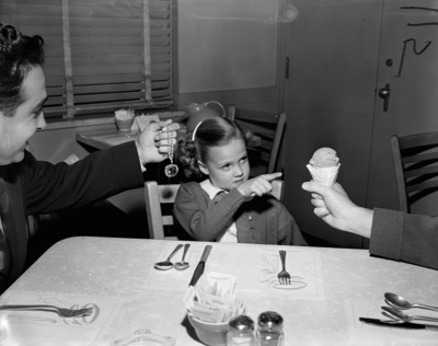 Given her pick between the Hope diamond and an ice cream cone at Meacham Field when the famous gem arrived, Suzzanne Smith, 5, of 4014 Curzon, decides which one she would rather have. Suzzanne Smith is shown seating at a table looking at and pointing her finger at the ice cream. Published in the Fort Worth Star-Telegram morning edition, November 14, 1950.