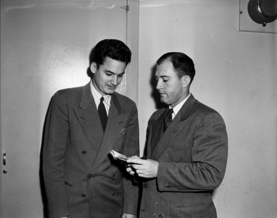 Rev. Lory Hildreth of Handley Baptist Church, left, and Rev. Woodrow Fuller, superintendent of missions for Tarrant County Baptist Association, were named leaders in the county for a revival of all Baptist churches. The campaign was part of a revival held among more than 8,400 Baptist churches west of the Mississippi. Rev. Mr. Hildreth was the general chairman of the campaign and Rev. Mr. Fuller the organizer. Published in the Fort Worth Star-Telegram evening edition, January 25, 1950.