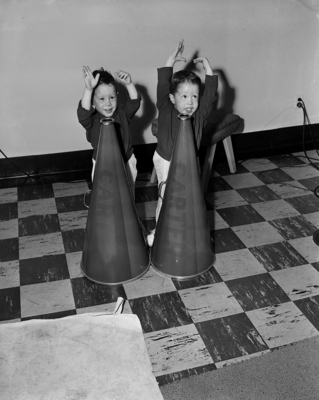 Maybe the tiniest mascot cheerleaders in football, Mike, left, and Pat Thompson, 2-year-old red-haired twins, appeared at Farrington Field to root for Amon Carter Riverside High School against Polytechnic High. They are sons of Mr. and Mrs. Don Thompson, 1314 Shadow Lane. Published in the Fort Worth Star-Telegram evening edition, November 17, 1950.