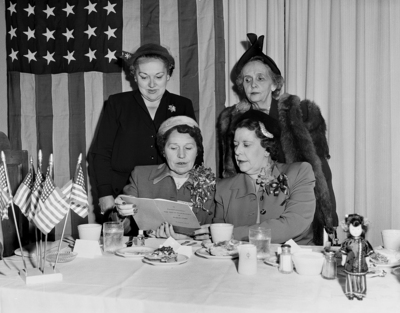 Mrs. Oscar Ahlgren, Whiting, Ind., right, seated, first vice president of the General Federation of Women's Clubs, looked over the program for the closing day of the Texas federation convention at Hotel Texas. With her were Mrs. J. Howard Hodge, Midland, left, seated, Texas president; Mrs. M. Howard Gibson, Waxahachie, standing left, state executive committee member, and Mrs. R. E. Cox, Fort Worth hostess for Mrs. Ahlgren, and herself a director of the TFWC. Published in the Fort Worth Star-Telegram evening edition, November 16, 1950.