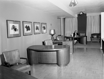 This is a view of the new Executive Furniture Gallery at Hogan's Fort Worth Office Supply, which was added to the firm for exhibiting the Stow and Davie line of office furniture. In the background is Miss Mary Bednar, secretary to Royal Hogan, store owner. Published in the Fort Worth Star-Telegram morning edition, November 19, 1950.