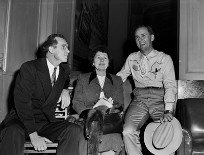 Pictured with Mrs. J. Howard Hodge of Midland, president of the Texas Federation of Women's Clubs, are Delbert Downing, manager of the Midland Chamber of Commerce, left, and Duke Jimerson, director of the Midland Lions International Official Band. Published in the Fort Worth Star-Telegram morning edition, November 17, 1950.