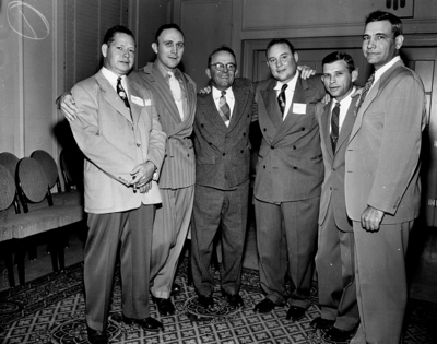 Bud Taylor, Connie Sparks, Coach Dutch Meyer, Durward Horner, David O'Brien and Allie White reminisce at TCU Ex-Lettermen's Association dinner. Published in the Fort Worth Star-Telegram morning edition, November 18, 1950.