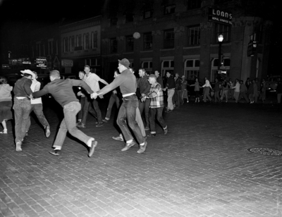 Snake-dancers working up spirit for TCU's homecoming game with University of Texas halt traffic in downtown Fort Worth in prelude to a bonfire and other homecoming activities. Published in the Fort Worth Star-Telegram morning edition, November 18, 1950.