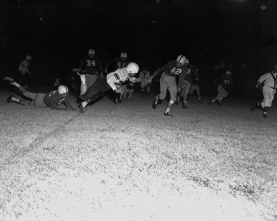 Edward Beach, Wichita Falls back, starts toward turf after being tripped by the reaching hand of Everett Jones (on ground) of Childress in the game at Wichita Falls. Play gained six yards. Published in Fort Worth Star-Telegram morning edition November 19, 1950.