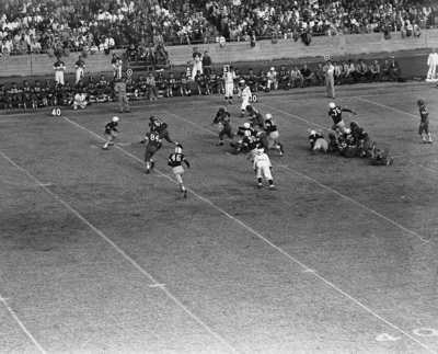 Good blocking clears Rice's Gordon (Sonny) Wyatt past Texas A&M's left end as Bill Howton (84) and Gene Little (61) bear down Aggies' Yale Larry (28). That's Rice's George Glauser (42) on the ground and A&M's Augie Saxe (46) and James Fowler (90) trying to recover. Rice won, 21-13. Published in Fort Worth Star-Telegram evening edition November 20, 1950.