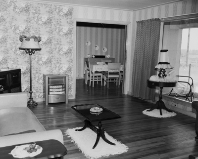 An Interior shot of the living-dining room area in the Warren Smith farm home near Paducah, which was built from a "Homes for the Southwest" plan and financed by the Farms Home Administration. Published in Fort Worth Star-Telegram morning edition December 3, 1950.