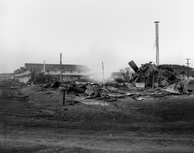 Three of the four empty barracks destroyed by fire at Camp Wolters continue to smolder in the picture. Barracks in the background were slightly damaged by the blaze which started from a gas fire. Smoke from the fire was visible eight miles away. Published in the Fort Worth Star-Telegram morning edition, November 20, 1950.