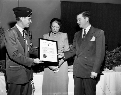 Lionel Bevan Jr. of The Fair, right, and Miss Estelle Lancaster, store personnel director, receive from Joe Spurlock an American Legion award for the practice of hiring physically-handicapped veterans and non-veterans. Published in the Fort Worth Star-Telegram morning edition, November 20, 1950.