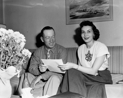Jake Mayfield of Juno, president of the Texas Sheep and Goat Raisers Association, left, and Mrs. Dolph Briscoe Jr., Uvalde, right, president of the association auxiliary, make plans for their two groups' convention. Published in the Fort Worth Star-Telegram evening edition, November 20, 1950.
