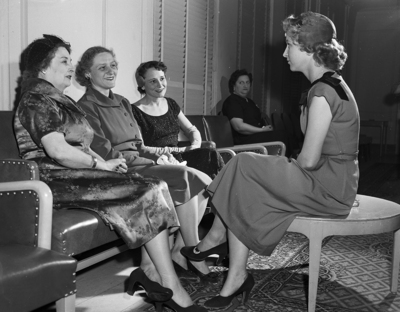 A quarter of visitors to the Auxiliary to the Sheep and Goat Raisers meeting were, left to right, Mmes. H. C. Noelke of San Angelo, Hondo Crouch of Comfort, William B. Wilson of San Angelo, and Miss Sue Flanagan of San Angelo, extreme right. Published in the Fort Worth Star-Telegram morning edition November 26, 1950.