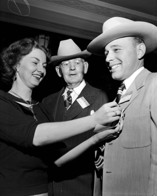 Miss Ann Hallam of Fort Worth pins a "San Angelo Next" ribbon on Miles Pierce of Alpine and Elbert Whitfiled of Millersview looks on as they registered for the Texas Sheep and Goat Raisers Association convention. Published in the Fort Worth Star-Telegram morning edition, November 21, 1950.