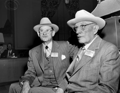 Harry Butz, left, sheep buyer in Fort Worth for Swift and Company for 39 years, talked market with J. T. Baker, pioneer Fort Stockton rancher, at the Texas Sheep and Goat Raisers Association convention. Published in the Fort Worth Star-Telegram morning edition, November 21, 1950.