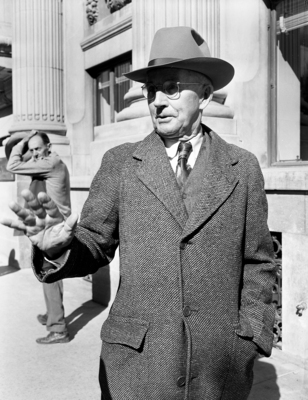 Bust photo of Tax Collector R. L. Ball. He is wearing a hat and a pair of glasses. Unidentified individual stands in the background. Published in the Fort Worth Star-Telegram evening edition, November 21, 1950.