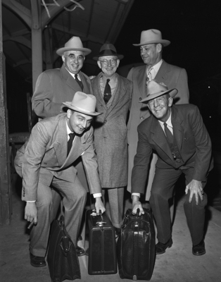 Robert (Chief) Myers, center, North Side High's first faculty football coach, gets welcome from former players as he arrives in Fort Worth morning for annual homecoming. Front are Mark Korolevich, left, president of North Side exes, and Rosco Minton. Rear, Bill Boswell, left; Myers and Sherriff Sully Montgomery. Boswell, Minton and Montogomery played under Myers at North Side. Published in the Fort Worth Star-Telegram evening edition November 21, 1950.